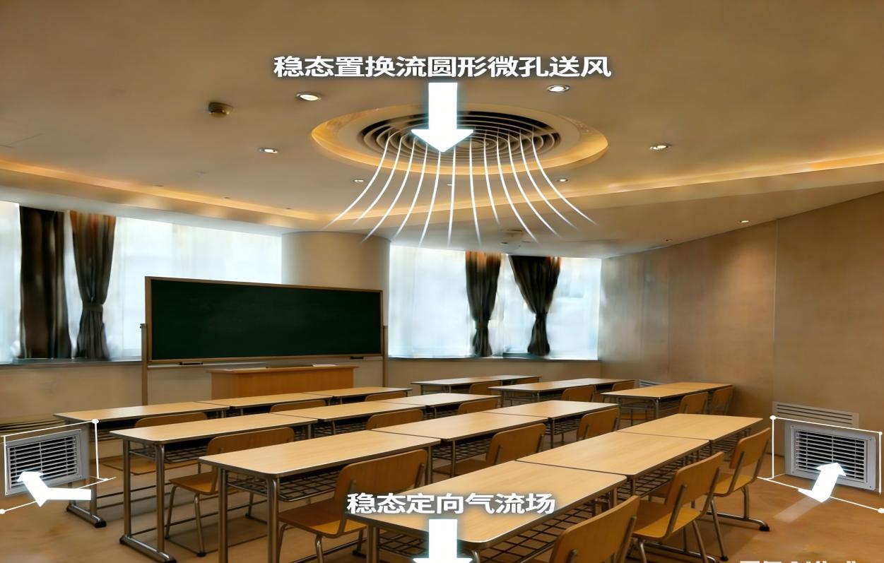 為解決中小學(xué)教室二氧化碳超標(biāo)、PM2.5污染、空氣渾濁等共性問(wèn)題,提升師生身心健康與教學(xué)效率,本方案以穩(wěn)態(tài)置換流(SSDV)技術(shù)為核心,采用教室中間圓形微孔送風(fēng)+下部回風(fēng)動(dòng)態(tài)排放模式,可穩(wěn)定實(shí)現(xiàn)PM2.5為零、負(fù)氧離子1000-1500個(gè)/cm3、二氧化碳<800ppm三大核心指標(biāo),同步降低空調(diào)能耗30%,兼具實(shí)用性與技術(shù)先進(jìn)性。